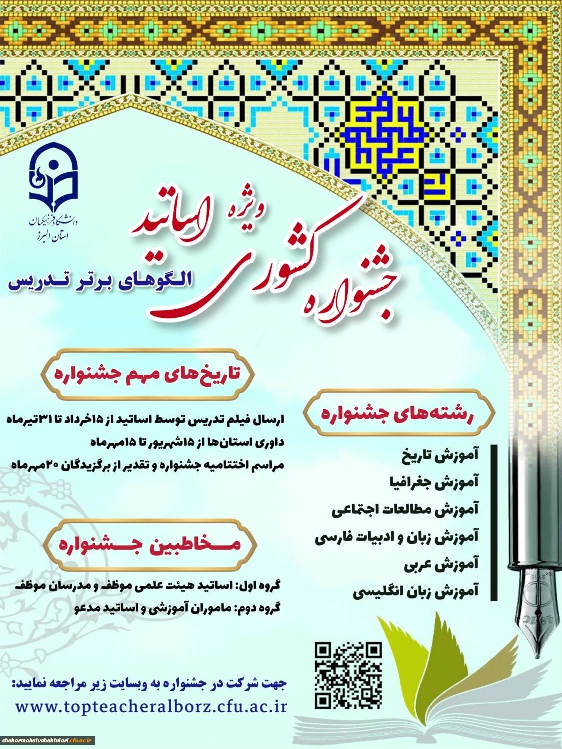 برگزاری جشنواره الگوی برتر تدریس را درگروه علوم انسانی، رشته های آموزش تاریخ، جغرافیا، مطالعات اجتماعی، زبان و ادبیات فارسی، عربی و زبان انگلیسی 2