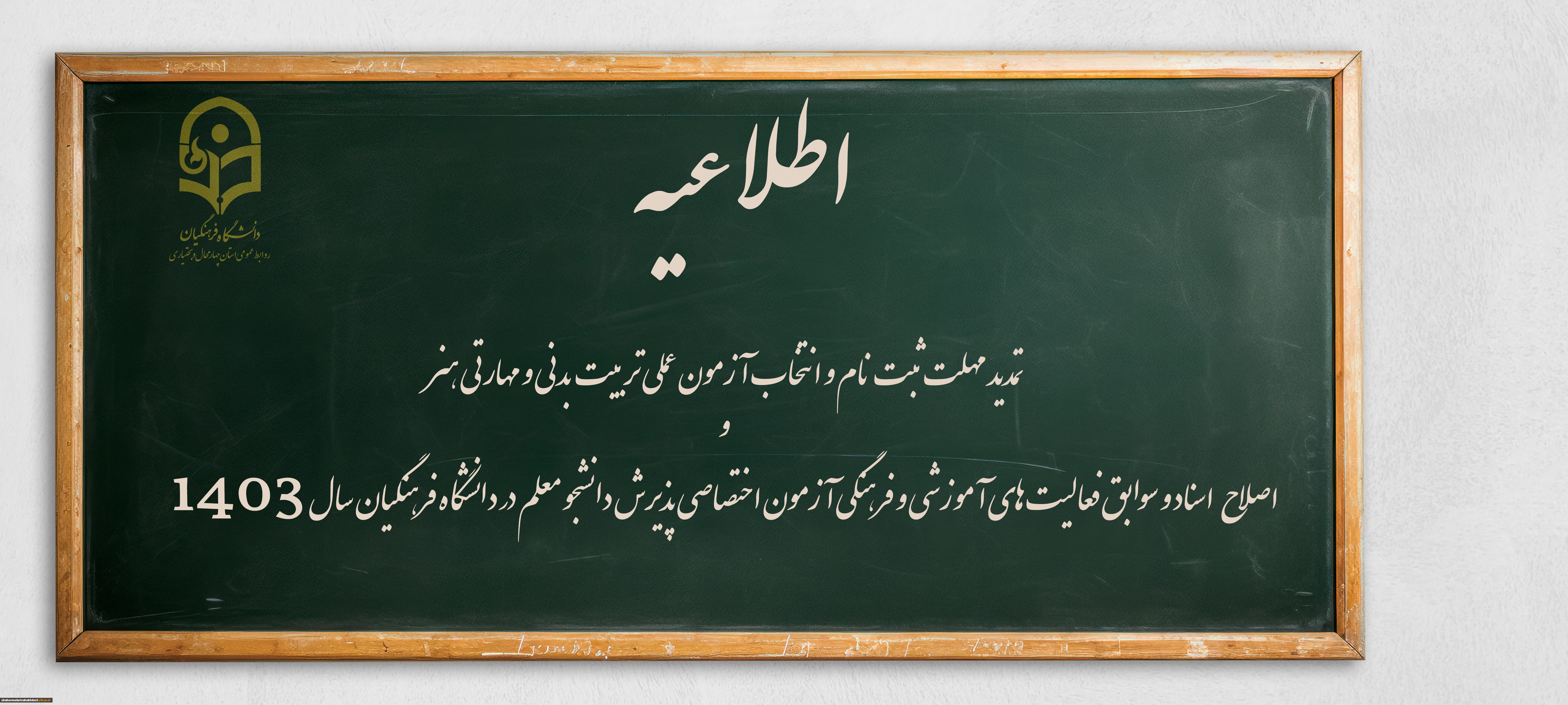 تمدید مهلت ثبت نام و انتخاب آزمون عملی تربیت بدنی و مهارتی هنر و اصلاح اسناد و سوابق فعالیت های آموزشی و فرهنگی آزمون اختصاصی پذیرش دانشجو معلم در دانشگاه فرهنگیان سال ۱۴۰۳ 2